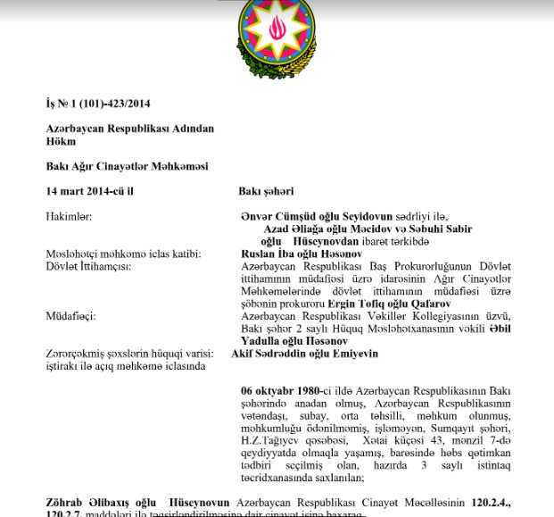 His regret did not work. Judge Anvar Seyidov sentenced him to life imprisonment on March 14, 2014, under case No. 1 (101) -423/2014.